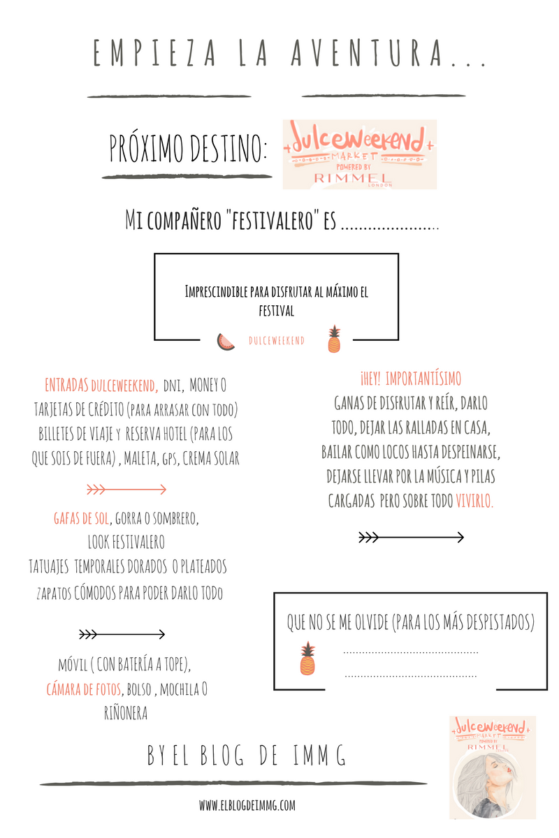 Aquí he puesto las cosas imprescindibles para vivir y disfrutar al máximo el festival .Mi parte favorita es la de la derecha: reír hasta que nos duela la barriga, bailar, cantar, disfrutar….. 🤞🏽. Aunque estas cosas las debemos hacer todos los días, no solo en los festivales! Y…… para los más despistados ( por ejemplo; yo 😂) he puesto un cuadradito para poder apuntar cosas que obligatoriamente no se nos pueden olvidar para el festiiiiiii. Yo ya tengo imprimida una para mi y la semana que viene me pondré manos a la obra con la maleta 🕺🏼¡Yuhuuuuu!